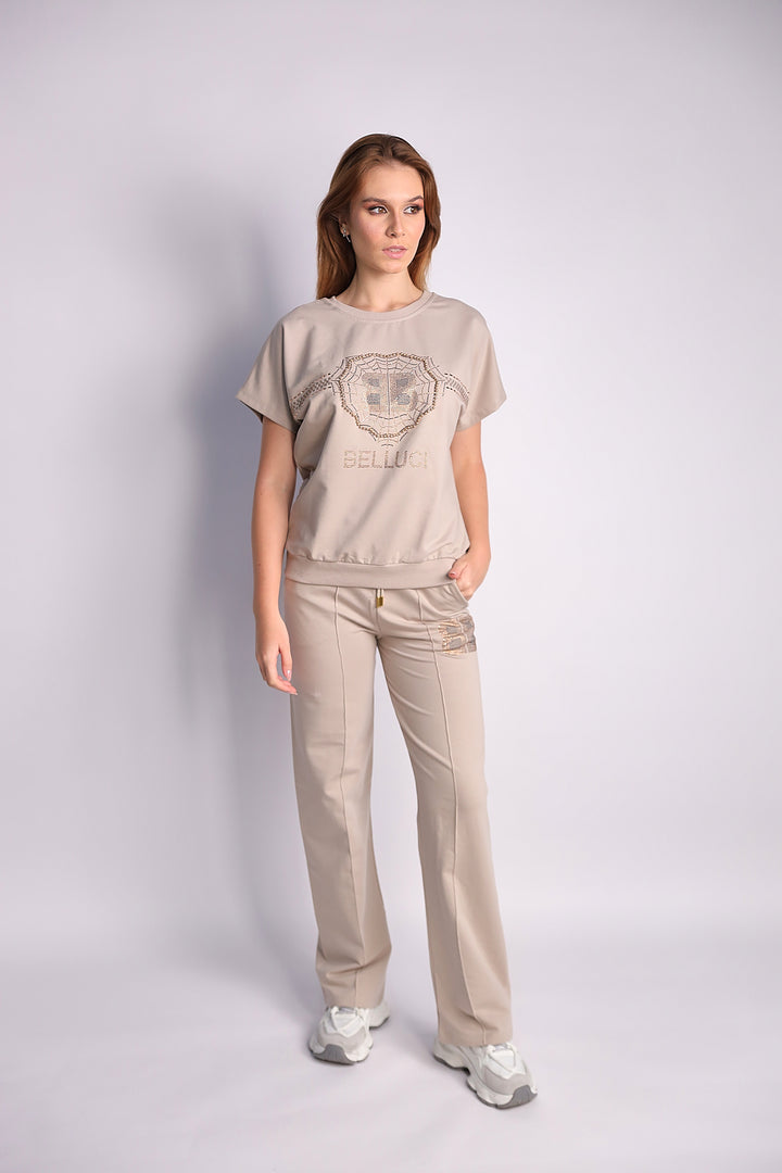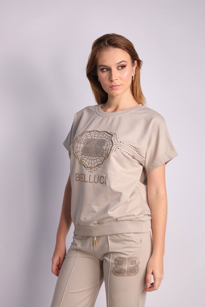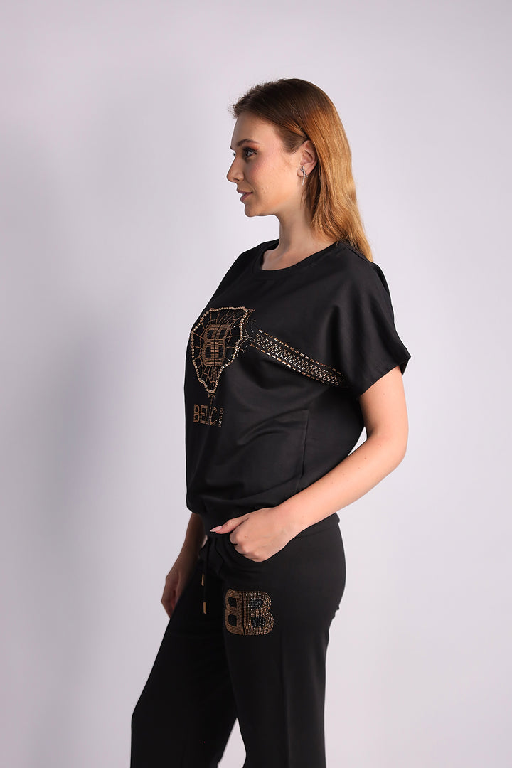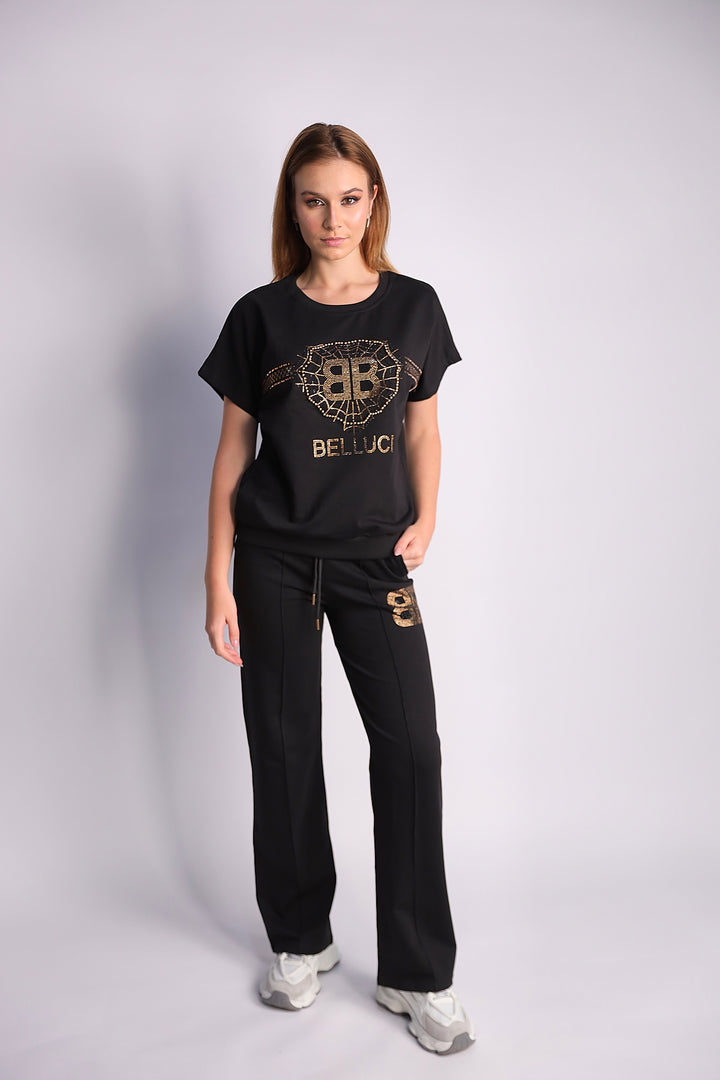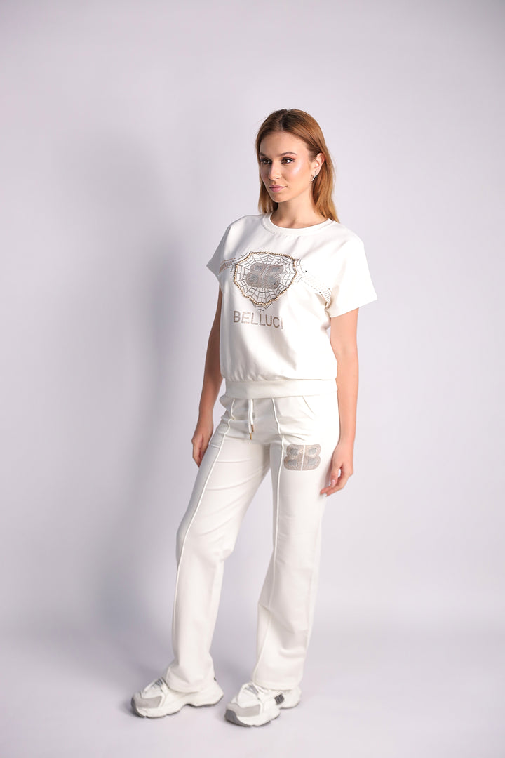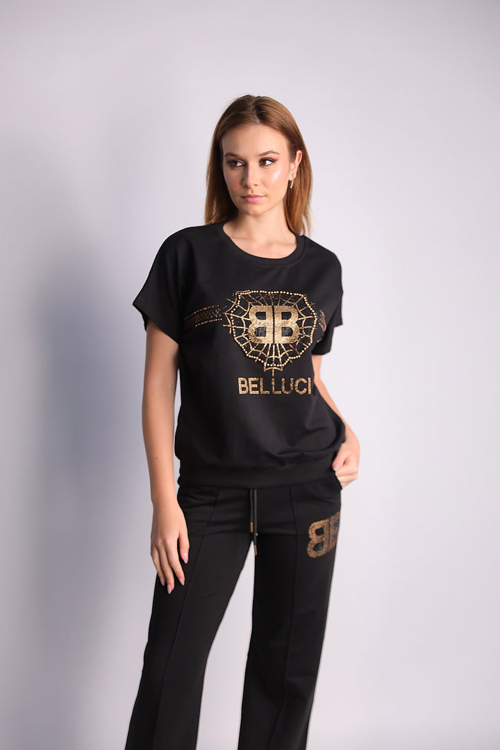 T-shirt features a unique graphic design resembling a web or net pattern across the chest, embellished with small sparkling details. Constructed from high-quality, breathable materials, it ensures comfort and durability during any activity. Its regal gold detailing adds a distinguished touch, elevating your athletic wardrobe with sophistication. Designed for a precise fit, this tracksuit supports dynamic movement while maintaining a polished, commanding presence. Ideal for those who seek excellence in both style and function.
