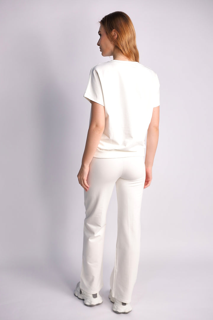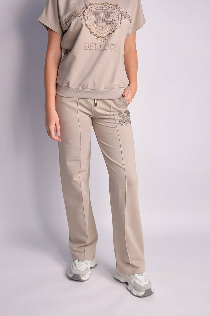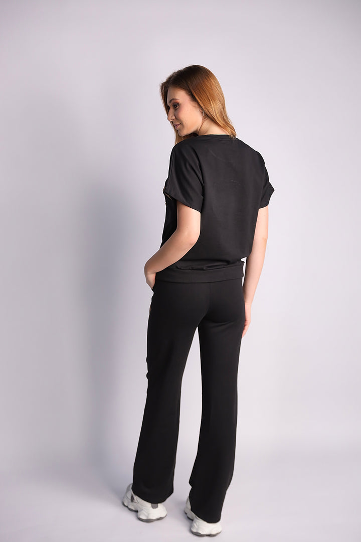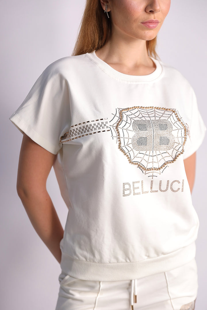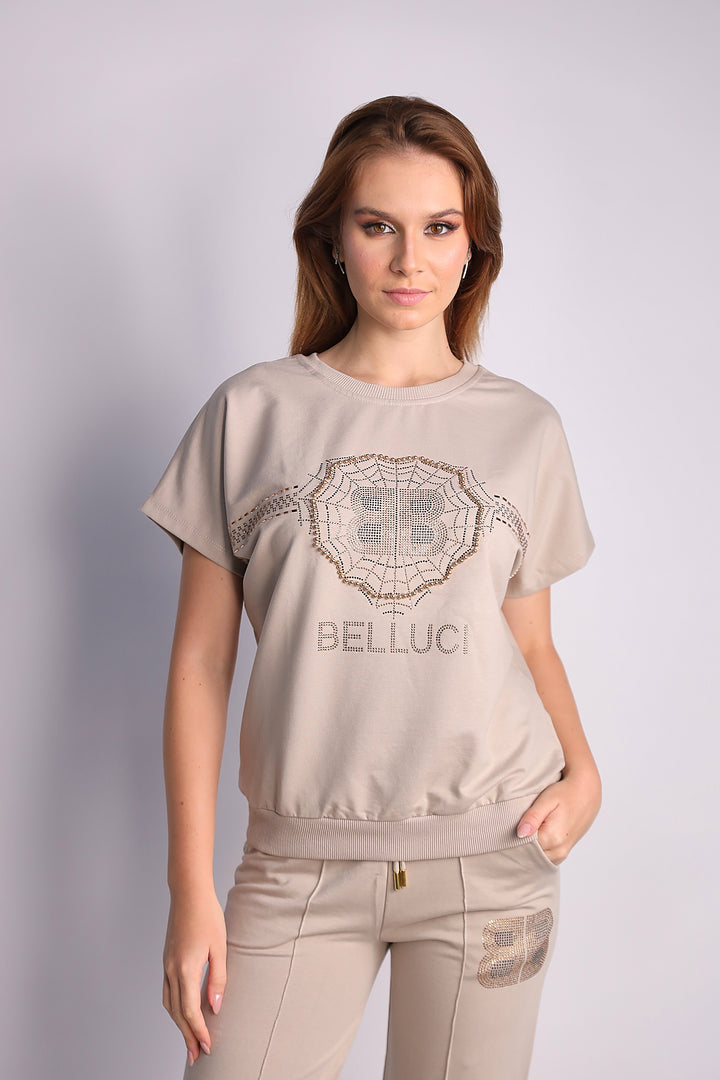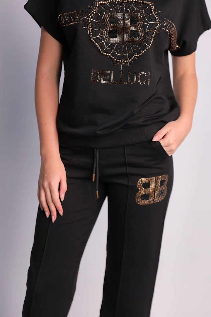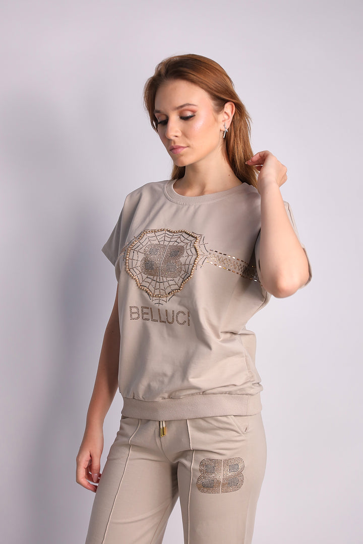 T-shirt features a unique graphic design resembling a web or net pattern across the chest, embellished with small sparkling details. Constructed from high-quality, breathable materials, it ensures comfort and durability during any activity. Its regal gold detailing adds a distinguished touch, elevating your athletic wardrobe with sophistication. Designed for a precise fit, this tracksuit supports dynamic movement while maintaining a polished, commanding presence. Ideal for those who seek excellence in both style and function.