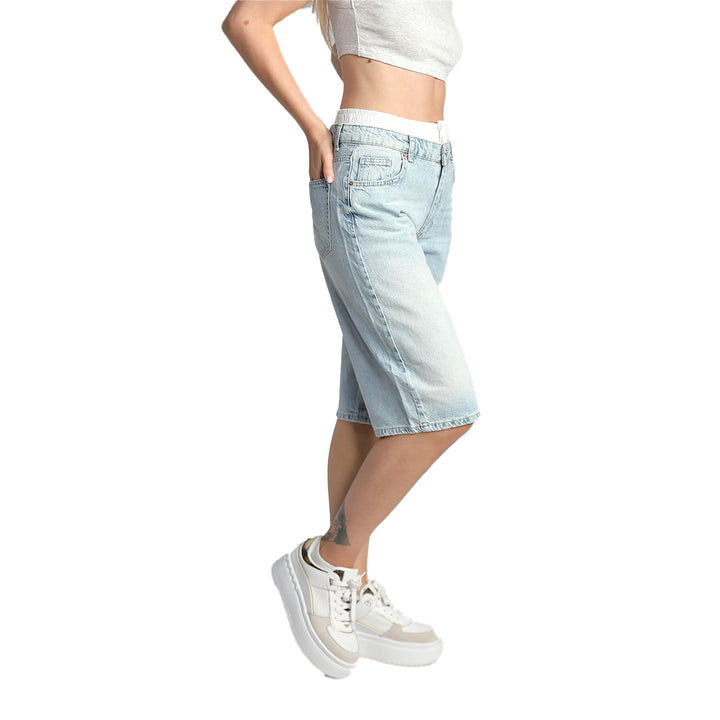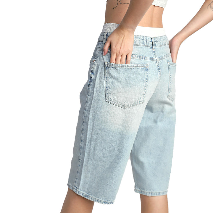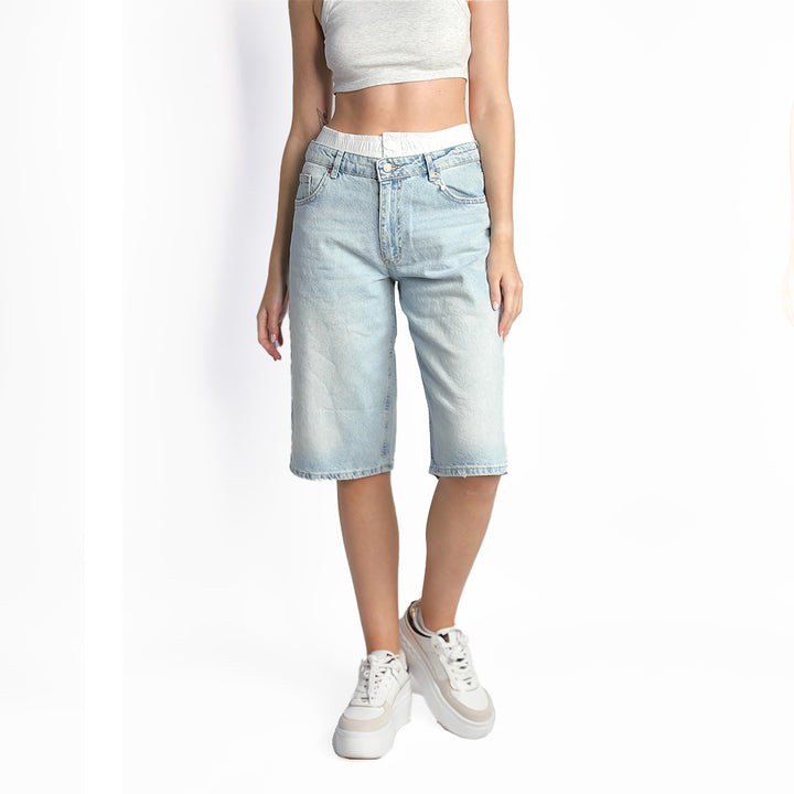 long, light-wash denim Bermuda shorts . These high-rise shorts feature a relaxed fit with a subtle A-line shape that extends to just below the knees. They have a classic five-pocket design, zip fly with button closure, and an elasticated waistband peek-through that adds a casual, layered element.