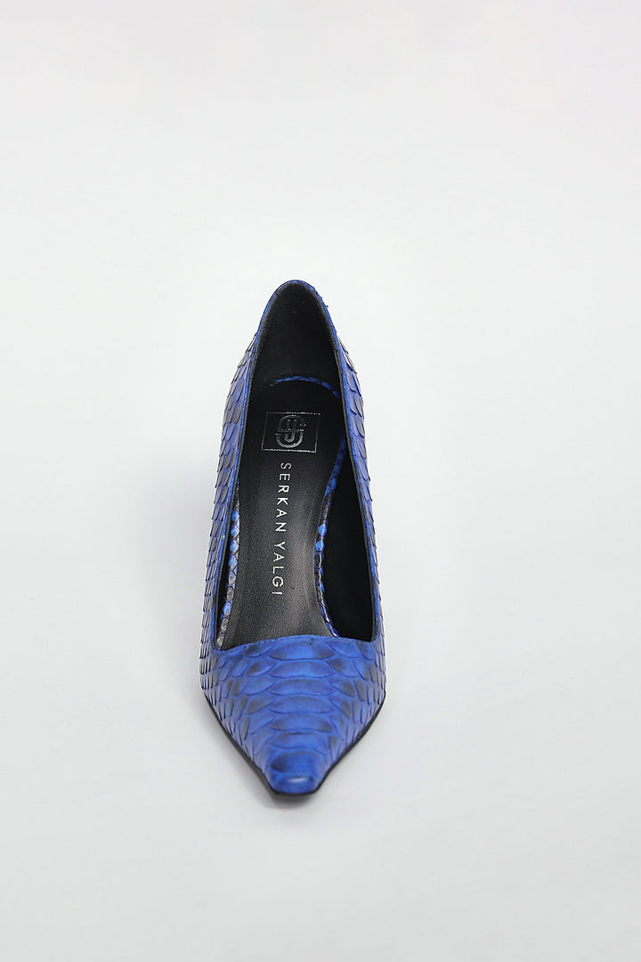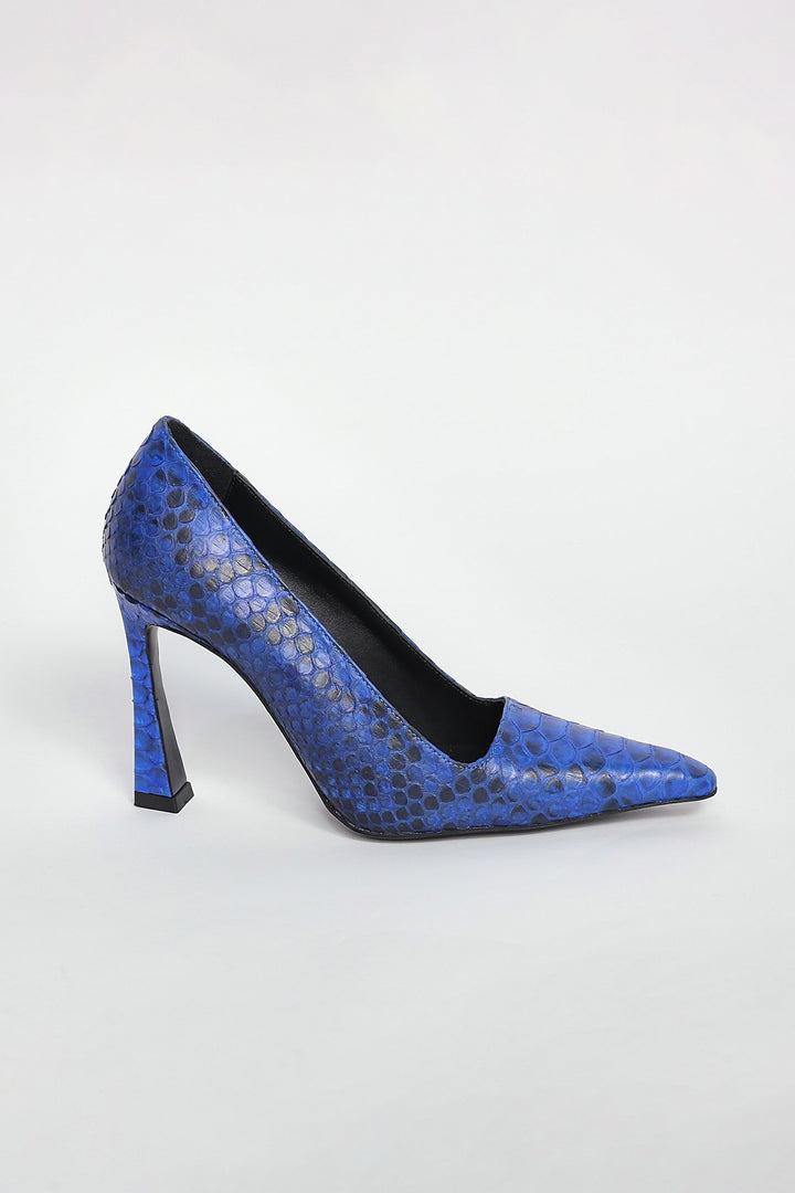 Deep royal blue with black snakeskin pattern detailing. This striking pointed-toe high heel features a bold and luxurious faux snakeskin texture. The shoe is designed with a unique flared block heel that offers a modern architectural twist, balancing elegance with edge. The high-gloss finish enhances the exotic pattern, making it a statement piece for any sophisticated or daring outfit.