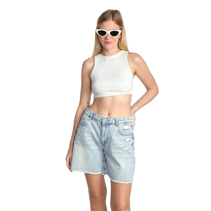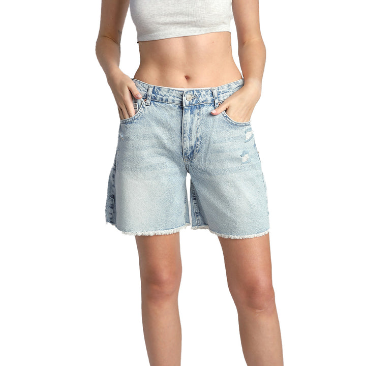 High-waisted, light-wash denim shorts with a relaxed fit. The shorts feature slight distressed detailing near the pockets and a raw hemline for a casual, worn-in look. They also include traditional denim elements like belt loops, a front button and zipper closure, and five-pocket styling.