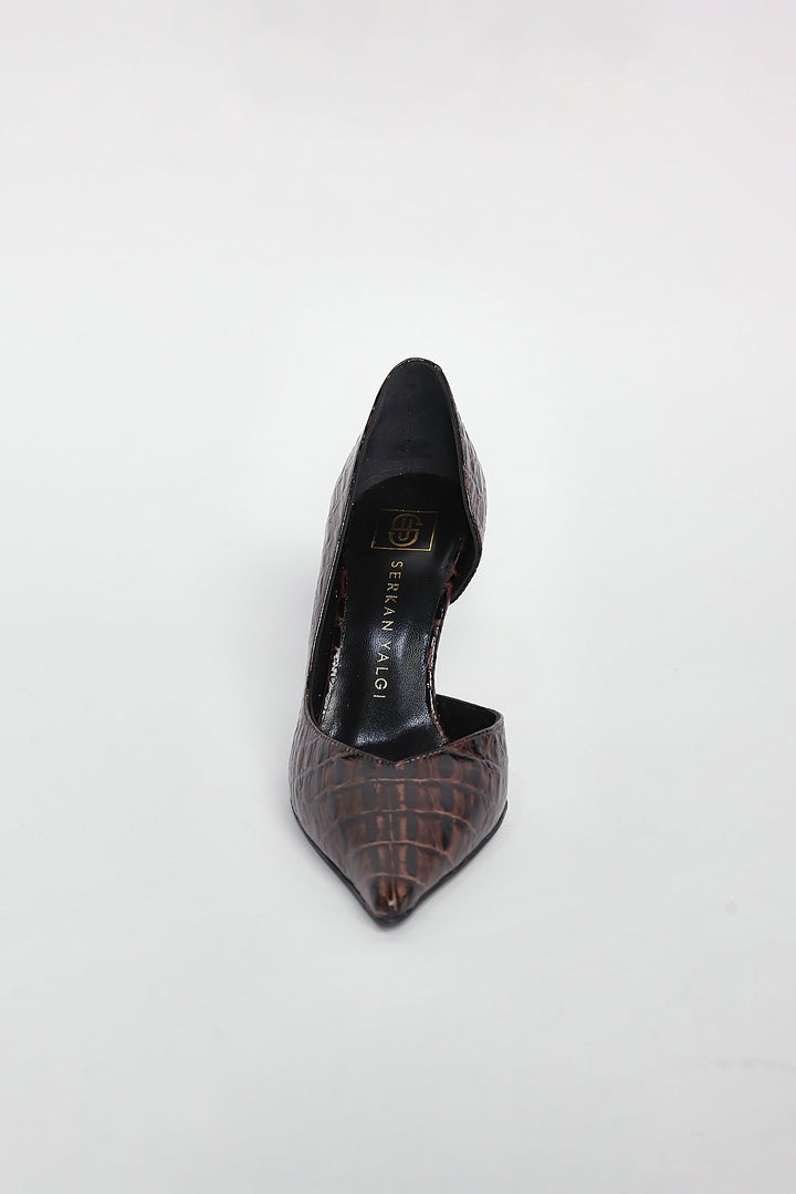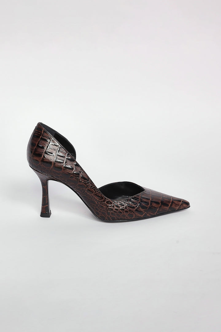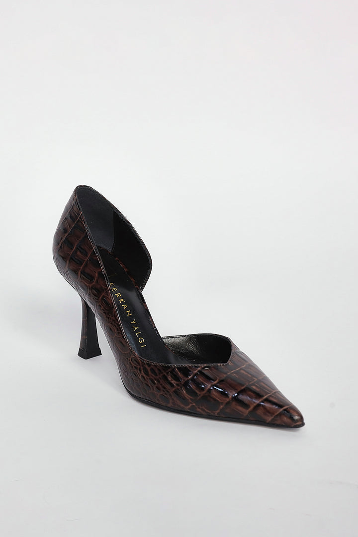 Elevate your style with our Brown crocodile leather heels. Crafted from luxurious crocodile-patterned material, these pumps exude elegance and sophistication. The sleek stiletto heel adds height and elongates the legs, while the croc print offers a unique touch. Elevate any outfit with these statement-making pumps.
