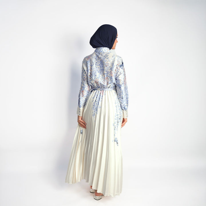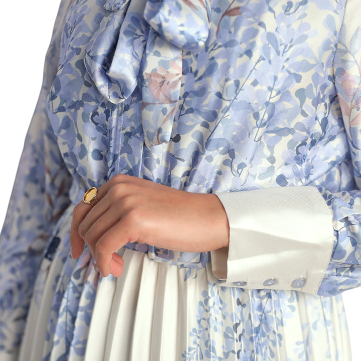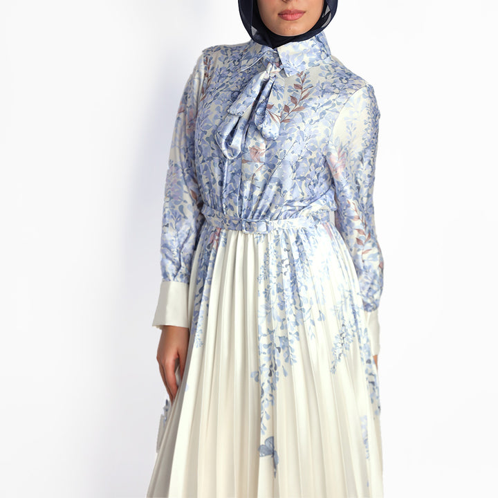 Long, elegant dress with a floral-patterned top and a high collar, finished with a bow tie. The skirt is cream-colored with pleats, creating a flowing silhouette.
