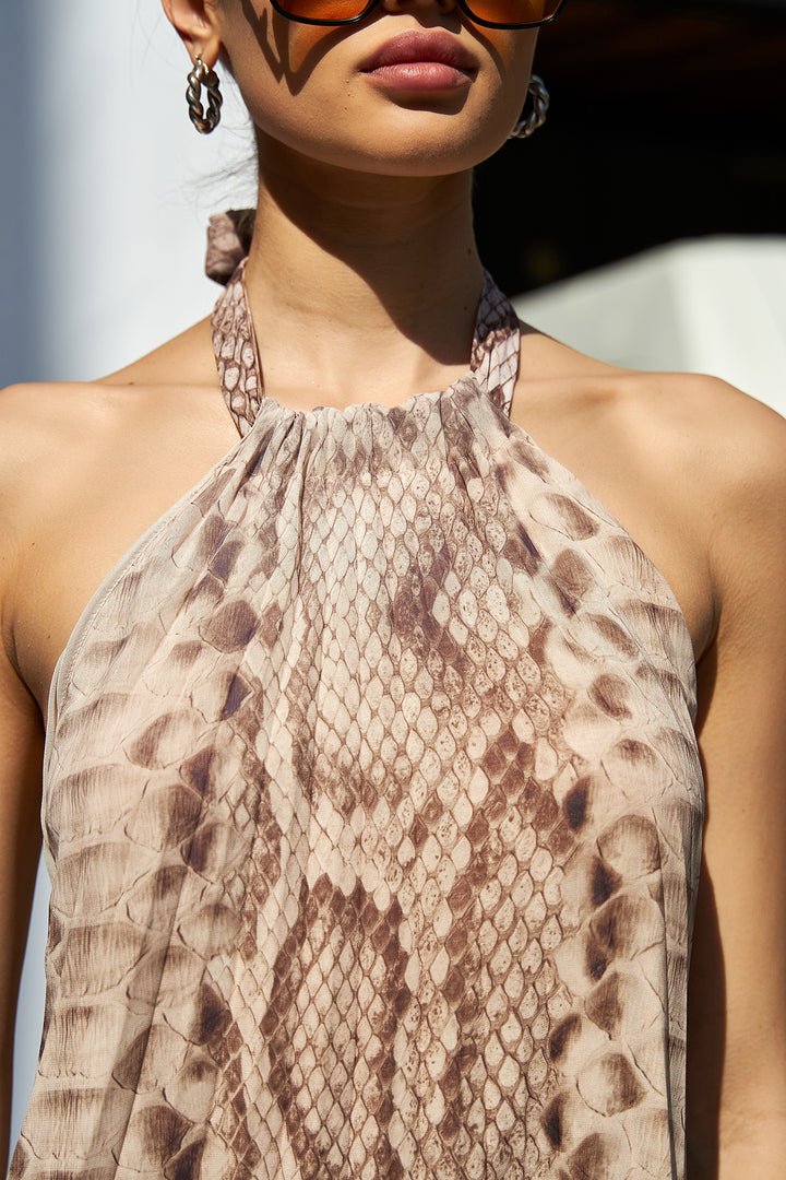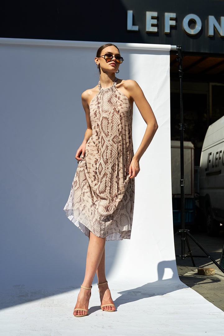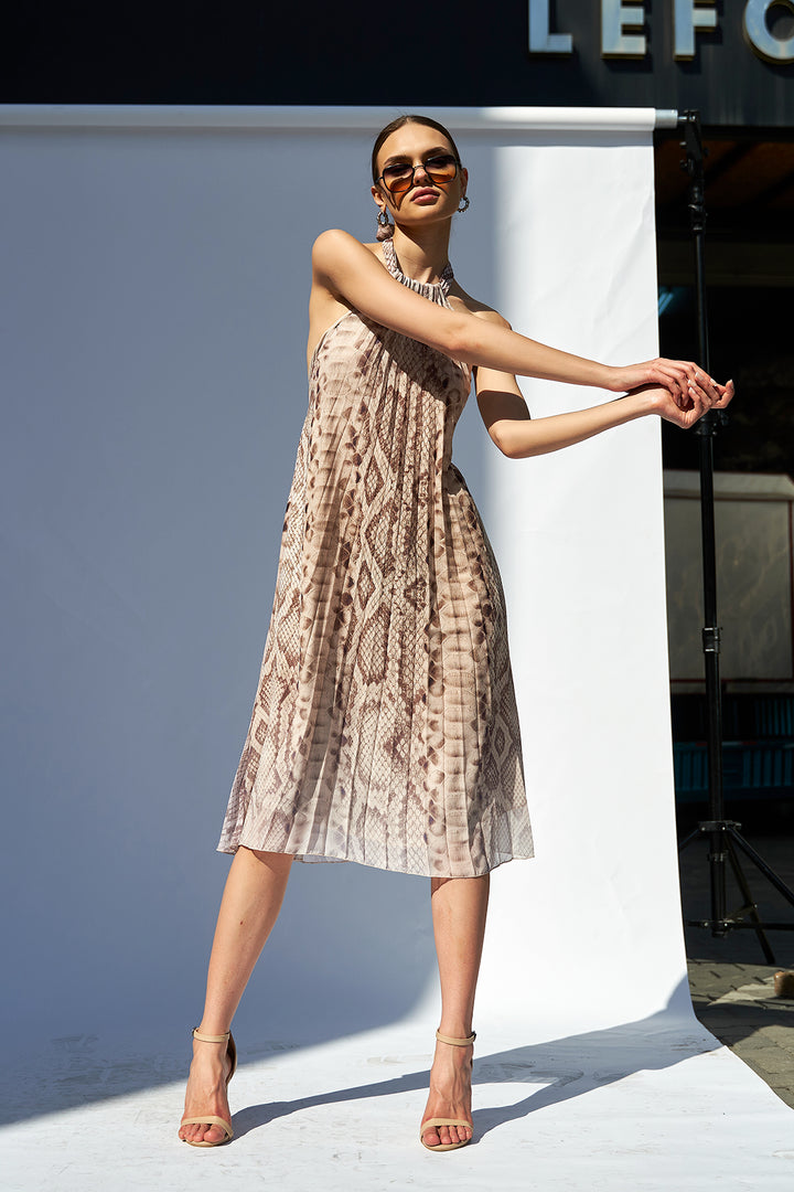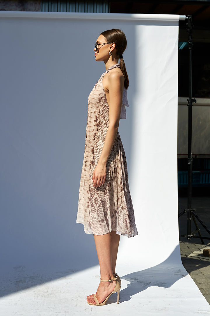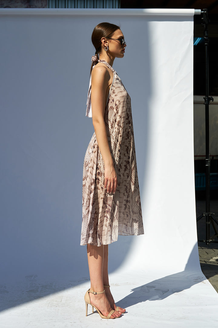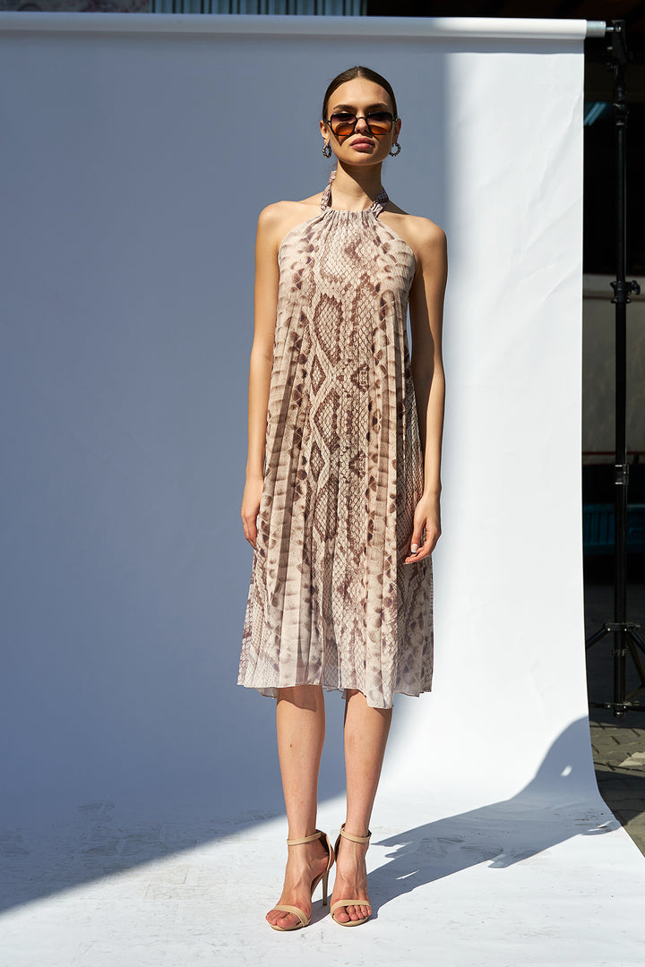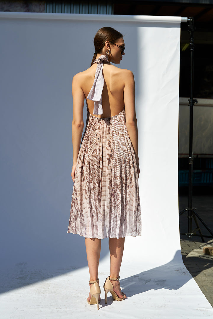 PLEATED DRESS WITH TIED HALT-COLLAR