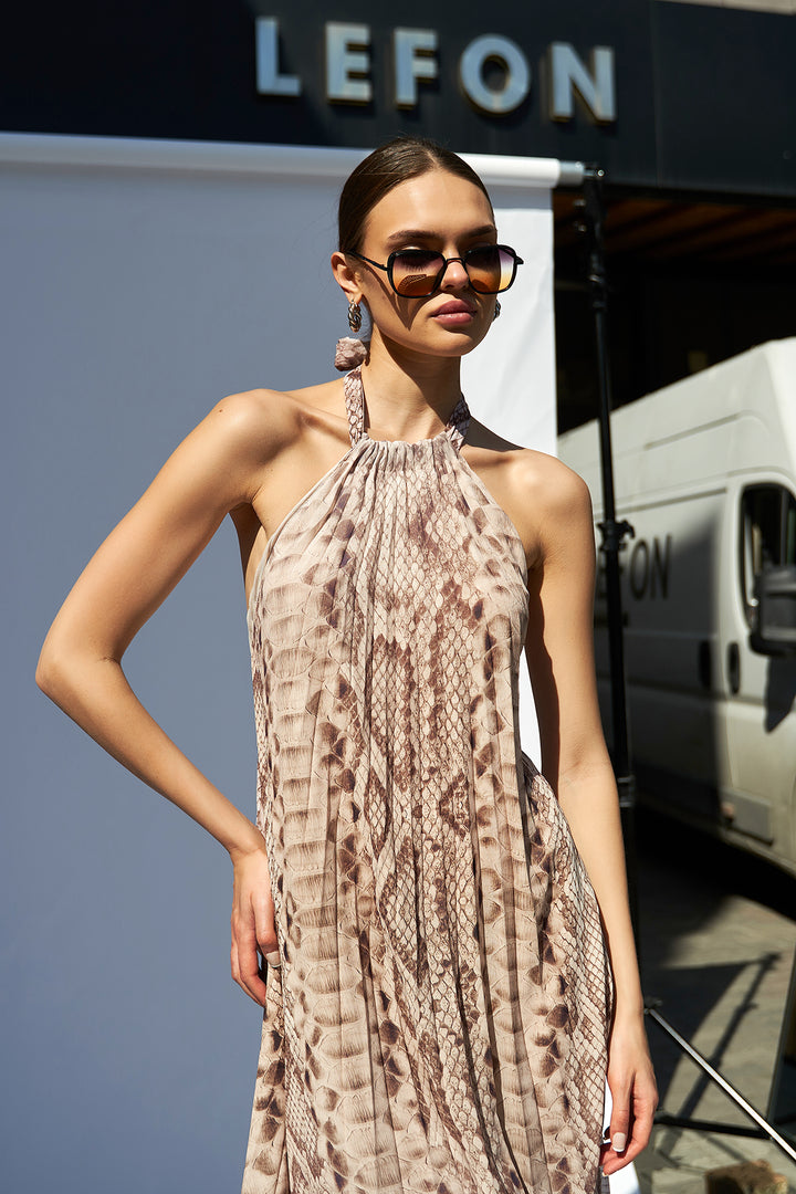 This expertly crafted pleated dress features an elegant tied halter collar design that accentuates the neckline while providing adjustable comfort. The precision pleating creates a flowing silhouette that moves gracefully with each step. Versatile enough for both formal occasions and sophisticated casual settings, this dress combines contemporary styling with timeless appeal.
