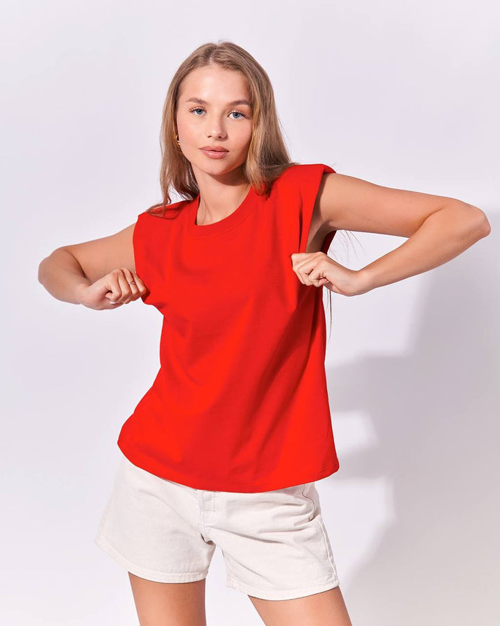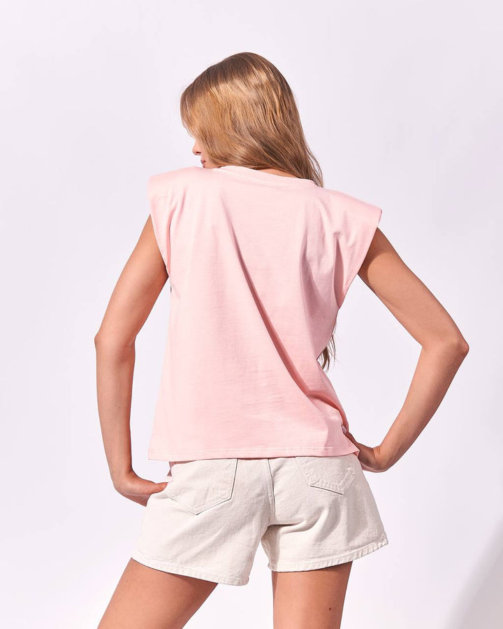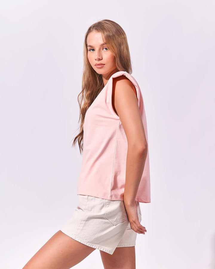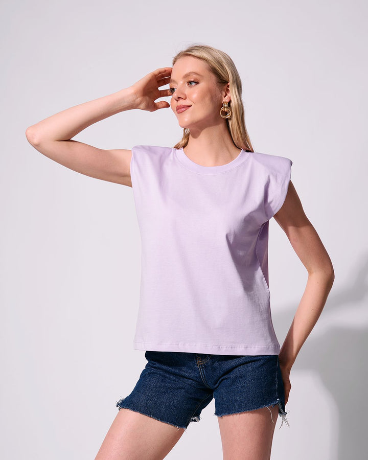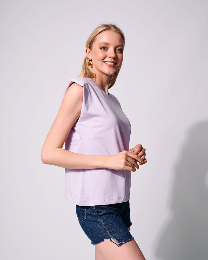 Casual, sleeveless top with a round neckline with puffed shoulder details. The top has a relaxed fit making it comfortable and stylish for everyday wear.