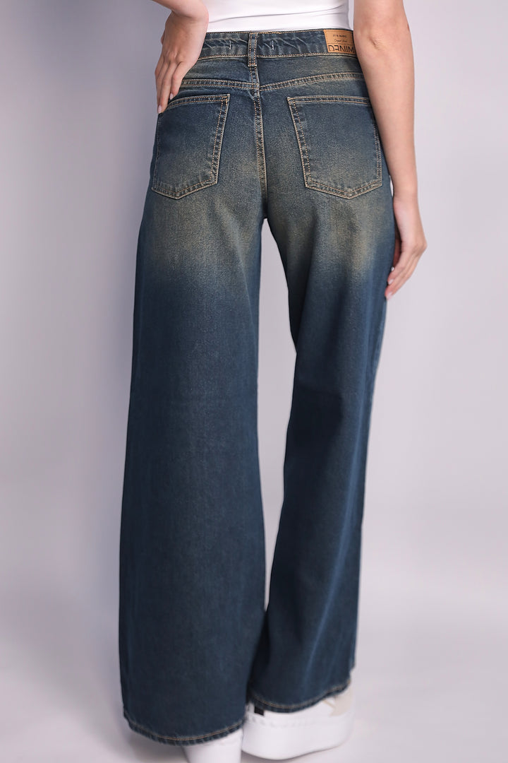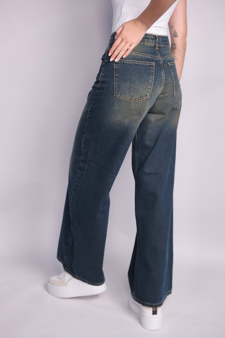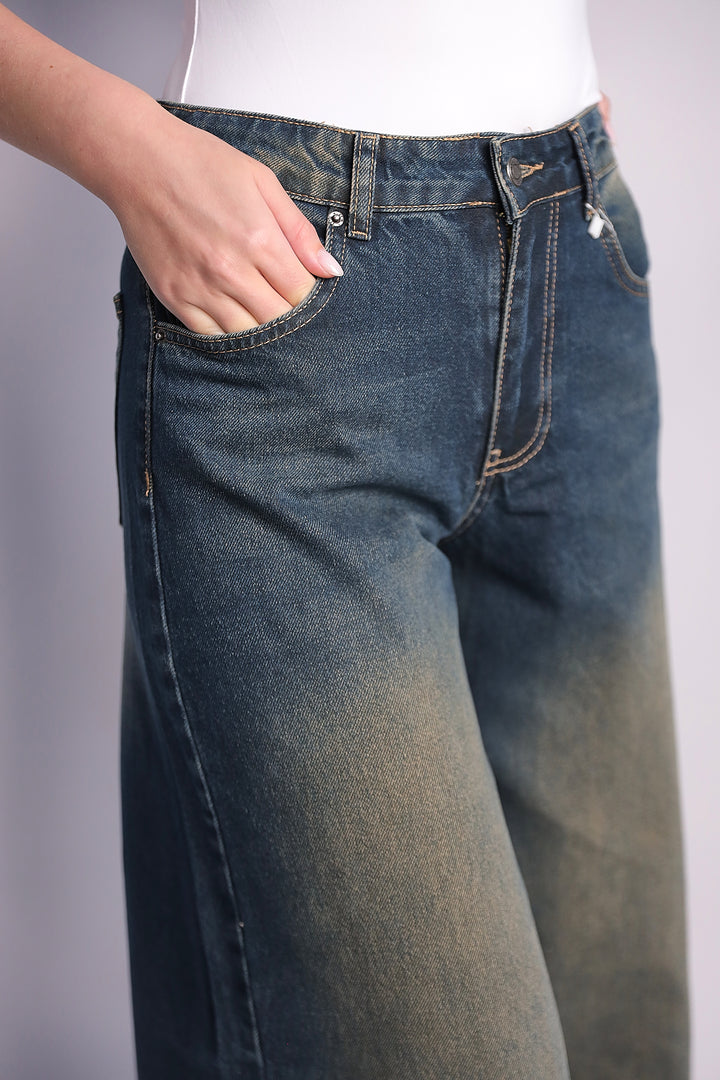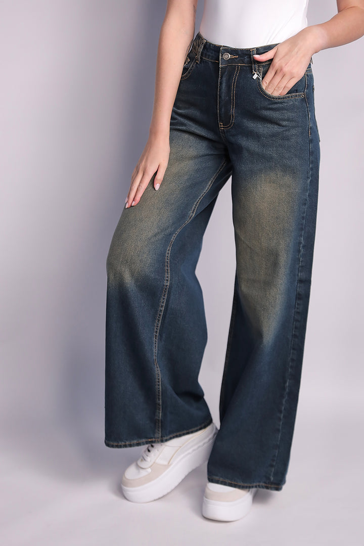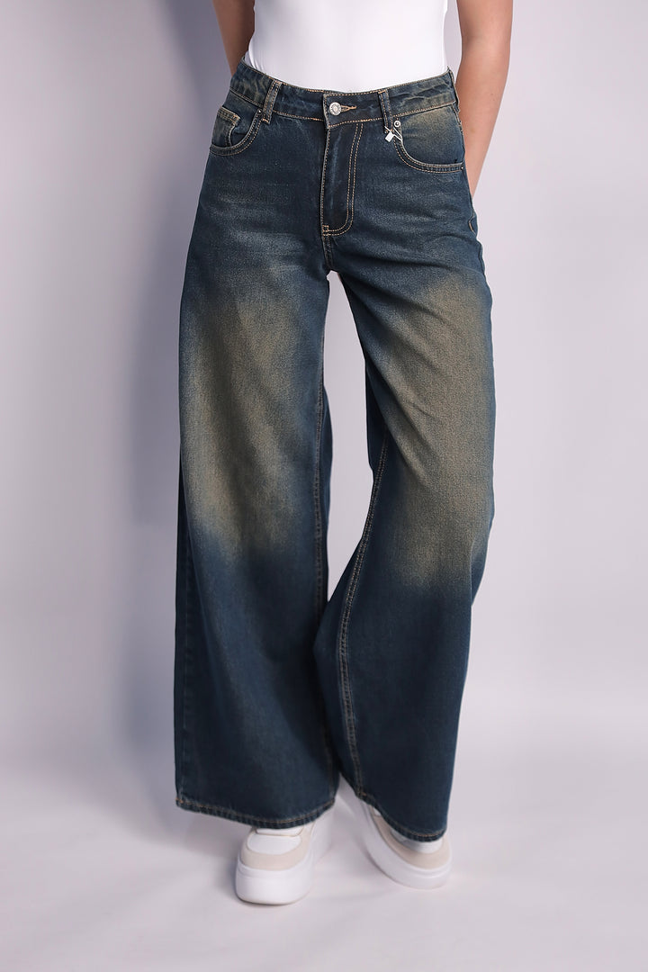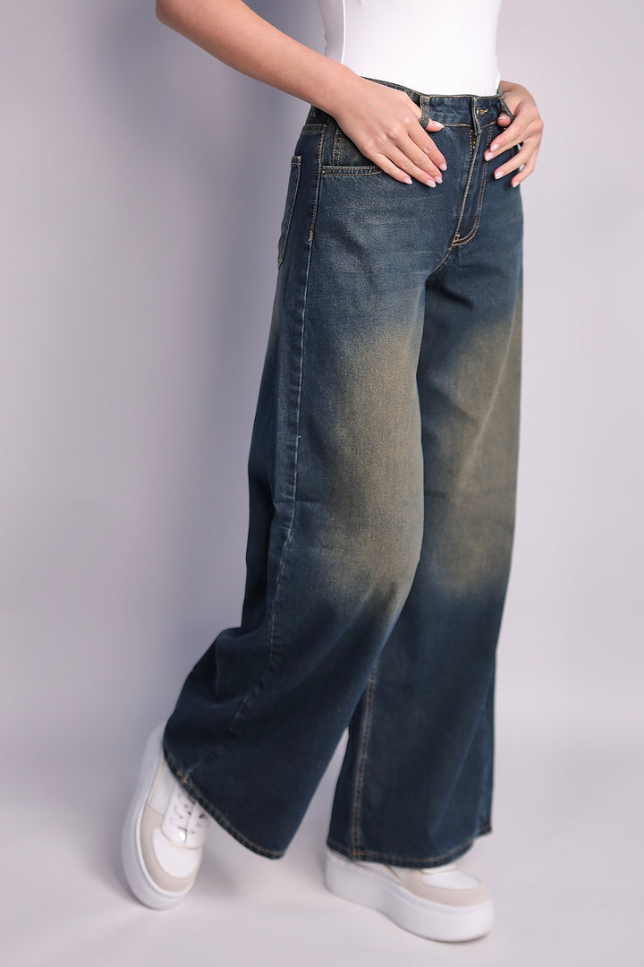 Dark wash, high-waisted wide-leg jeans with a subtle faded effect on the front thighs. These jeans feature classic five-pocket styling, visible stitching, and a slightly vintage worn-in look. The relaxed wide-leg cut offers both comfort and a fashion-forward silhouette, making them perfect for casual streetwear or dressing up with a fitted top. The hem falls all the way to the shoes, giving a modern and slightly retro vibe.