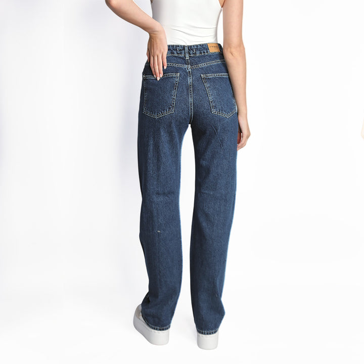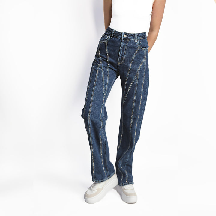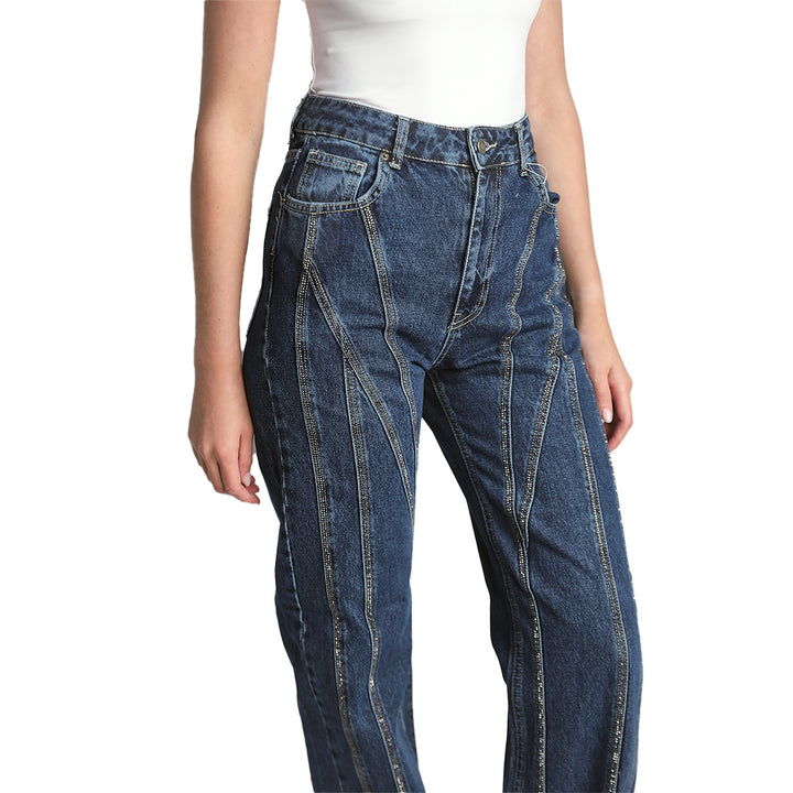 High-waisted jeans with vertical stitched patterns running down the legs, creating a distinctive striped design.