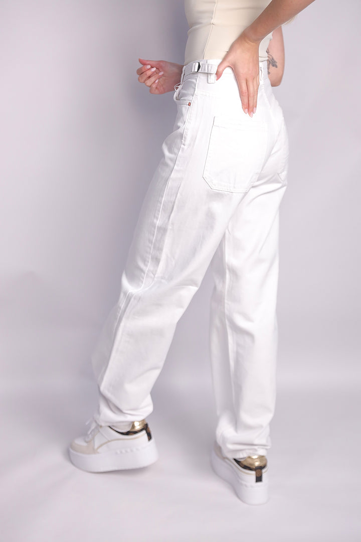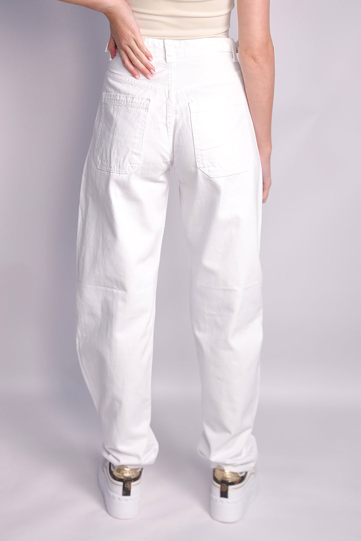 High-waisted, wide-leg jeans in a bright white color. They feature a classic five-pocket design and a relaxed fit.